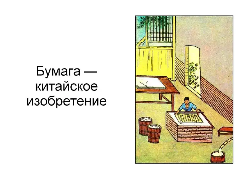 Д. Китайцы прославились изобретением бумаги. Массу из тряпок, коры, волокон конопли варили в котлах. Кашицу выливали на подносы, на дне которых лежал бамбук. Вода стекала, оставался