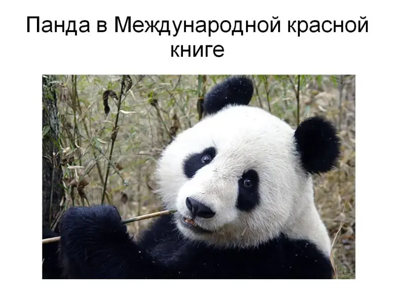 Д. Панда - одно из редких животных нашей планеты. Этого зверя называют бамбуковым медведем, потому что его любимая пища - ветки бамбука. Зверь этот внесён в Международную красную