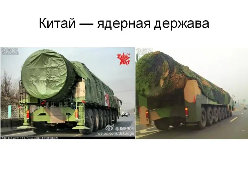 Китай обладает крупнейшей в мире армией, оснащённой, в частности, межконтинентальными баллистическими ракетами с ядерными боевыми блоками.
