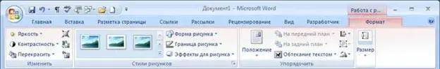 Текстовый редактор позволяет вставлять и форматировать графические изображения (иллюстрации) различных типов - рисунки из файлов, клипы (изображения из коллекции MS Office), схематичные изображения, состоящие из отдельных фигур, схемы и диаграммы. MS Word содержит весь необходимый набор средств и инструментов, осуществляющий добавление, коррекцию и форматирование этих изображений. Для работы с изображениями выделите изображение, на экране откроется вкладка Формат (Рис.1). С помощью вкладки Формат можно изменить следующие параметры изображения: