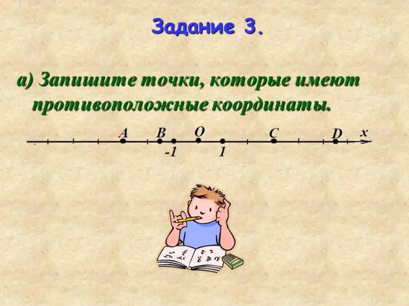 а) Запишите точки, которые имеют противоположные координаты. (слайд № 10)