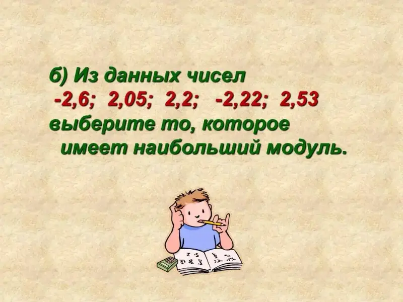 б) Из данных чисел -2,6; 2,05; 2,2; -2,22; 2,53 выберите то, которое имеет наибольший модуль . (слайд № 11)