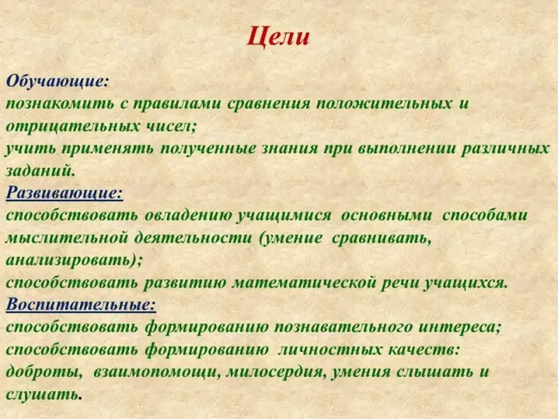 | 5 | Закрепление изученного материала. | 13 мин. | Формировать умение сравнивать рациональные числа, приводить примеры, аргументировать ответ. |