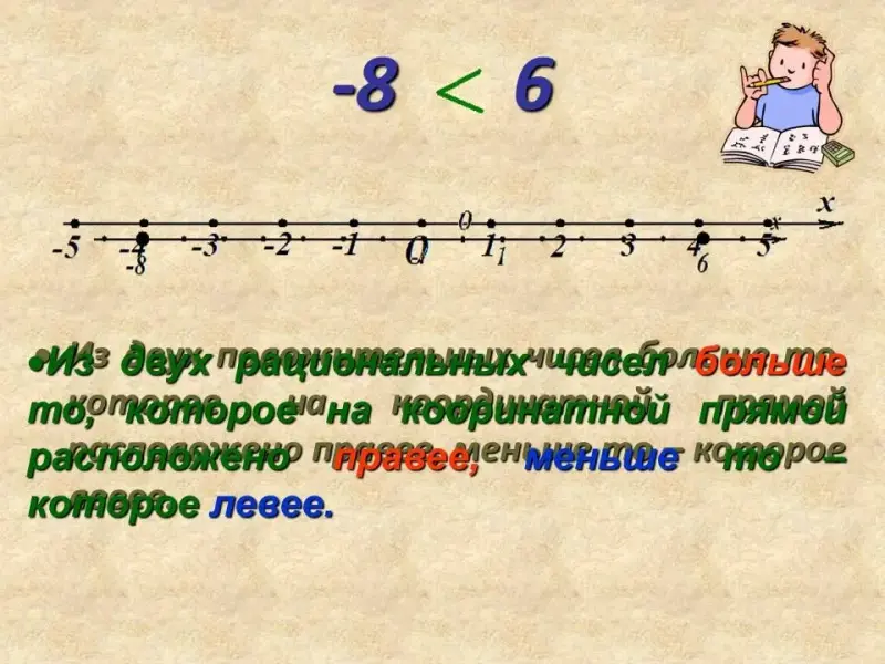 Из двух рациональных чисел больше то, которое на координатной прямой расположено правее, меньше то - которое левее.