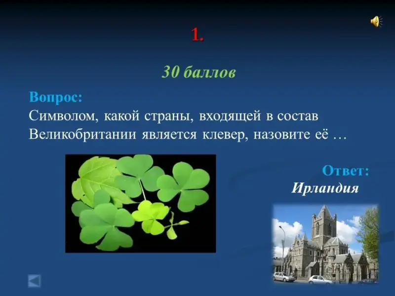 - Символом, какой страны, входящей в состав Великобритании является клевер, назовите её ... Ирландия