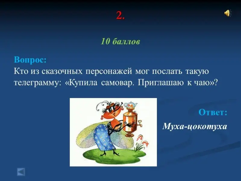 - Кто из сказочных персонажей мог послать такую телеграмму: "Купила самовар. Приглашаю к чаю"? муха-цокотуха