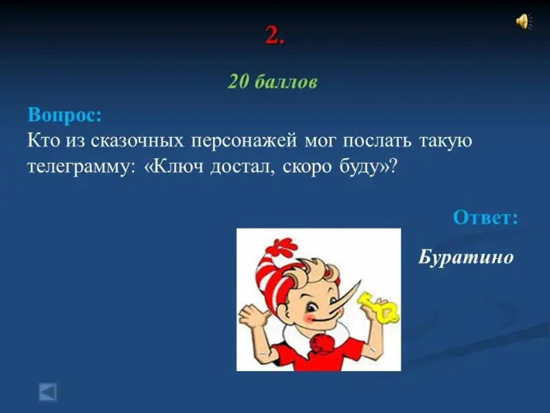 - Кто из сказочных персонажей мог послать такую телеграмму: "Ключ достал, скоро буду"? Буратино