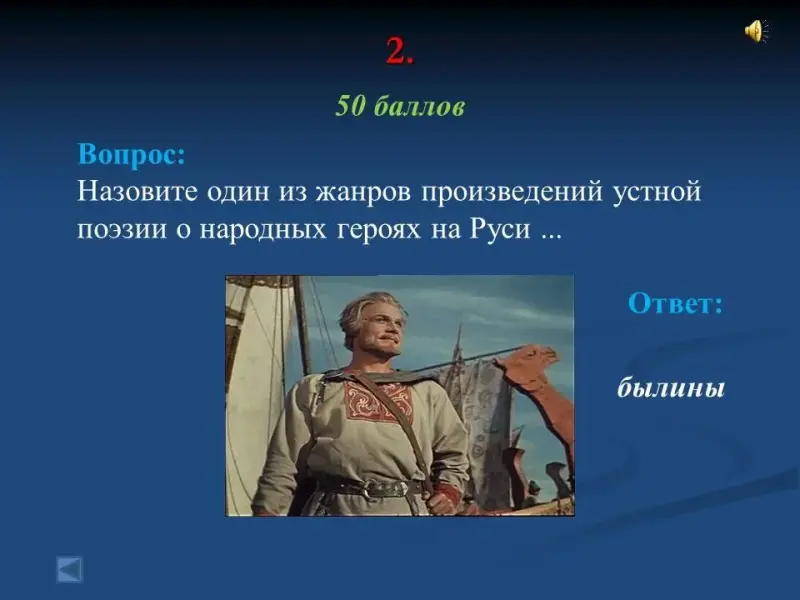 - Назовите один из жанров произведений устной поэзии о народных героях на Руси ... былины