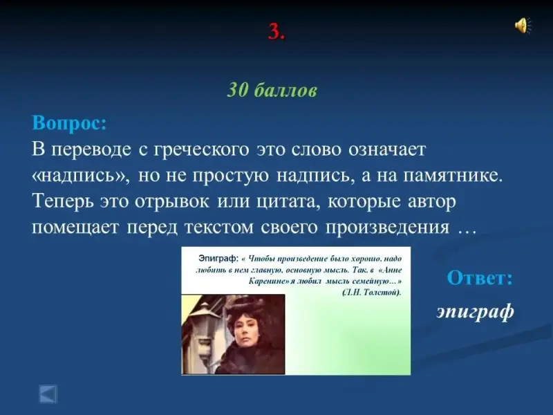 - В переводе с греческого это слово означает "надпись", но не простую надпись, а на памятнике. Теперь это отрывок или цитата, которые автор помещает перед текстом своего произведения ... эпиграф