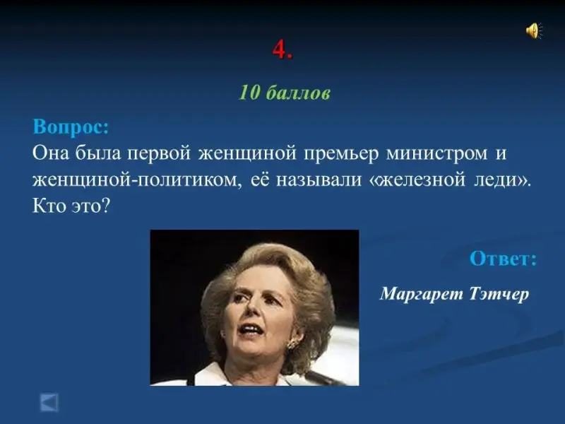 - Она была первой женщиной премьер министром и женщиной-политиком, её называли "железной леди". Кто это? Маргарет Тэтчер