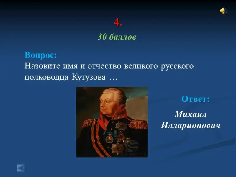 - Назовите имя и отчество великого русского полководца Кутузова ... Михаил Илларионович