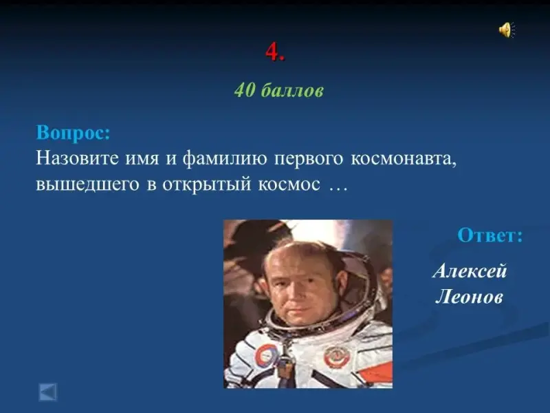 - Назовите имя и фамилию первого космонавта, вышедшего в открытый космос ... Алексей Леонов