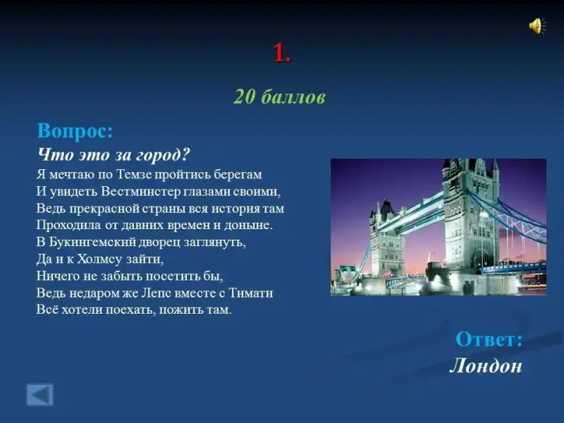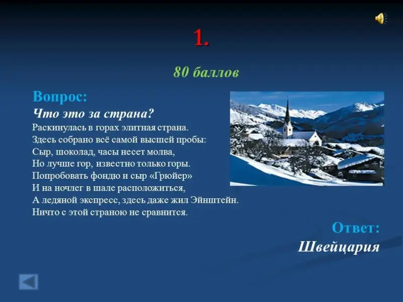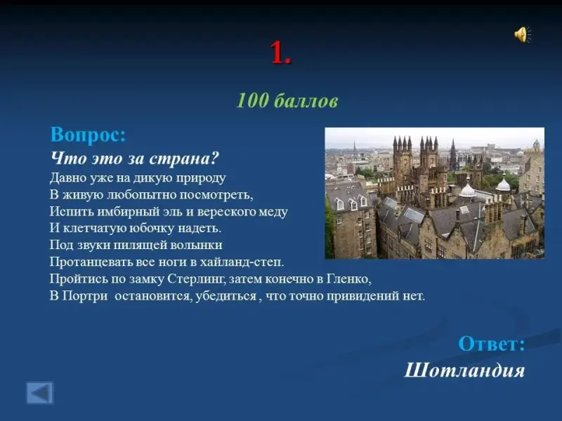 Презентация построена на общеизвестных и не совсем известных фактах о других странах, а также на знании культуры своей страны, её народного творчества и заимствованиях из других языков. По окончании подводится подсчет набранных баллов и определяется победитель. В презентации содержится 47 слайдов.