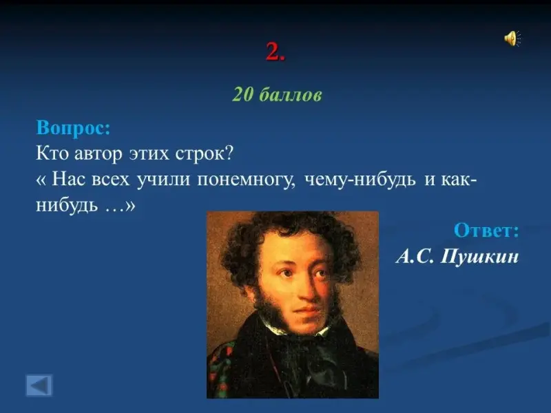 - Кто автор этих строк? " Нас всех учили понемногу, чему-нибудь и как-нибудь ..." А.С. Пушкин