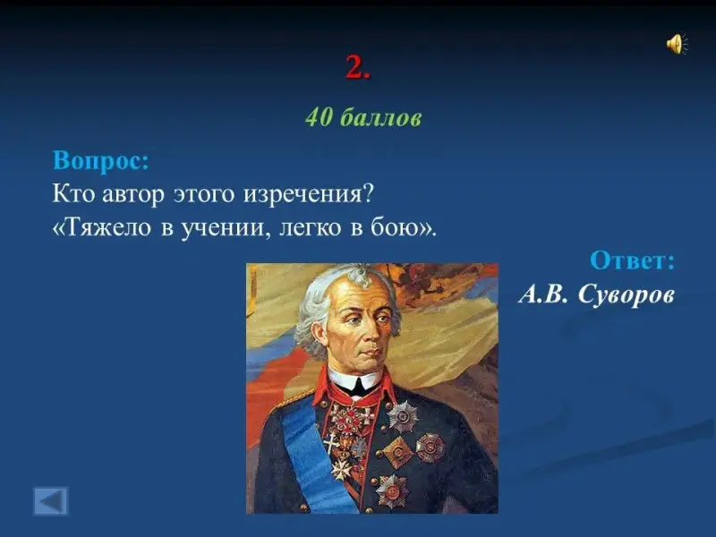 - Кто автор этого изречения? "Тяжело в учении, легко в бою". А.В. Суворов