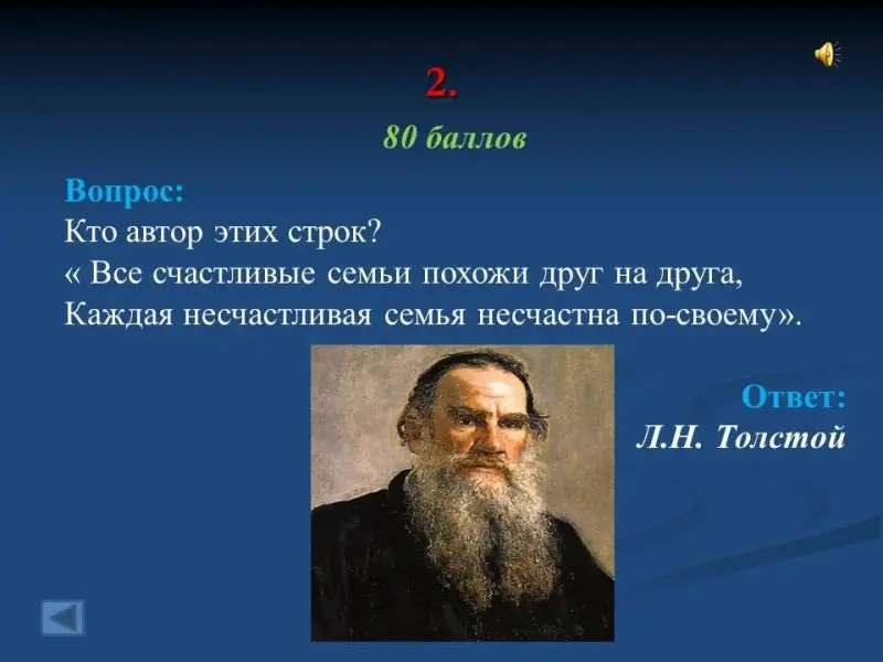 - Кто автор этих строк? " Все счастливые семьи похожи друг на друга, каждая несчастливая семья несчастна по-своему". Л.Н. Толстой