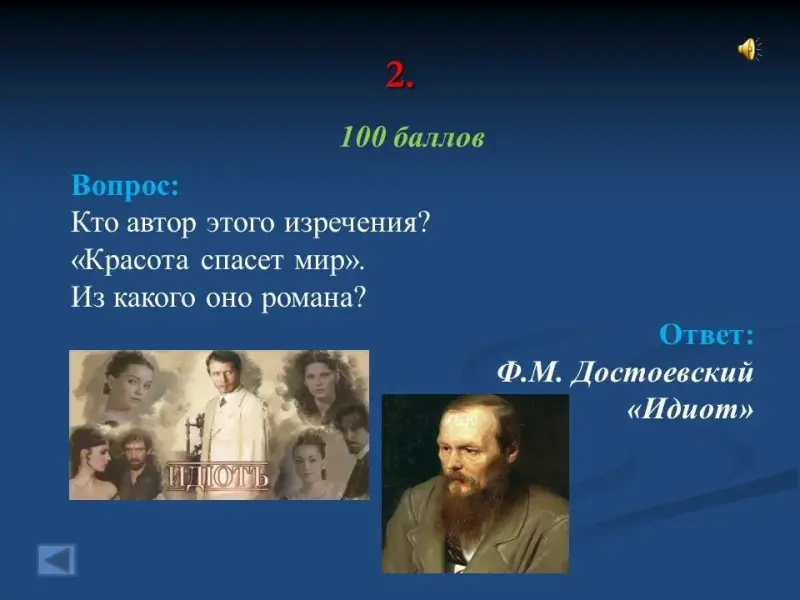 - Кто автор этого изречения? "Красота спасет мир". Из какого оно романа? Ф.М. Достоевский, "Идиот"