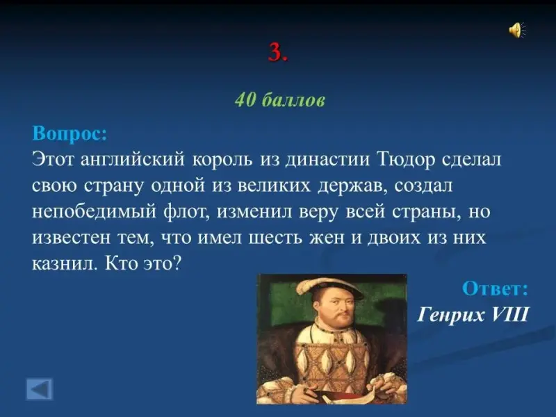 - Этот английский король из династии Тюдор сделал свою страну одной из великих держав, создал непобедимый флот, изменил веру всей страны, но известен тем, что имел шесть жен и двоих из них казнил. Кто это? Генрих VIII