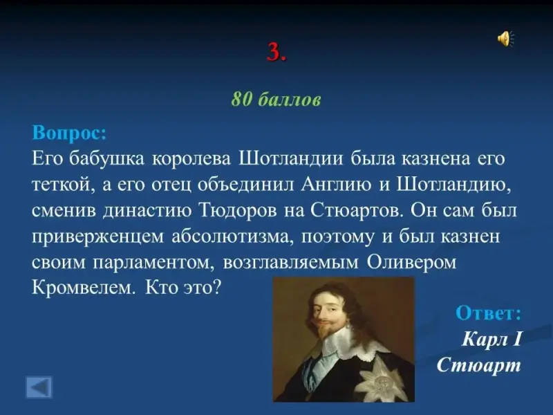 - Его бабушка королева Шотландии была казнена его теткой, а его отец объединил Англию и Шотландию, сменив династию Тюдоров на Стюартов. Он сам был приверженцем абсолютизма, поэтому и был казнен своим парламентом, возглавляемым Оливером Кромвелем. Кто это? Карл I Стюарт