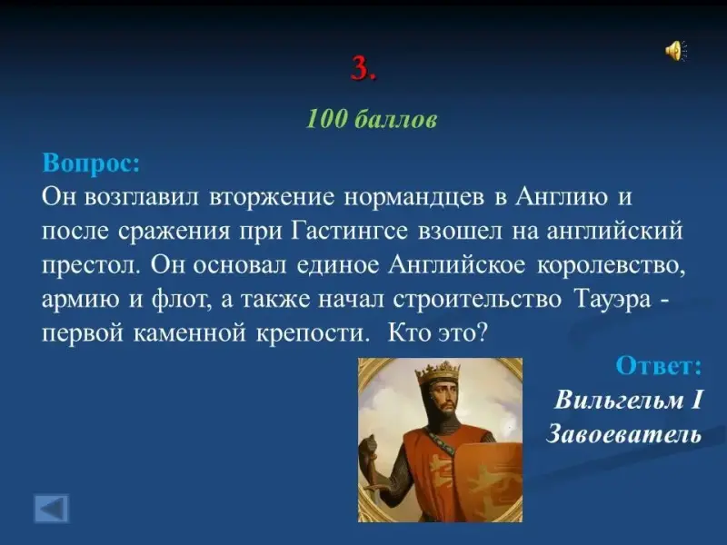 - Он возглавил вторжение нормандцев в Англию и после сражения при Гастингсе взошел на английский престол. Он основал единое Английское королевство, армию и флот, а также начал строительство Тауэра - первой каменной крепости. Кто это? Вильгельм I Завоеватель