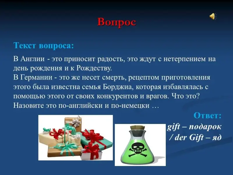 В Англии - это приносит радость, это ждут с нетерпением на день рождения и к Рождеству. В Германии - это же несет смерть, рецептом приготовления этого была известна семья Борджиа, которая избавлялась с помощью этого от своих конкурентов и врагов. Что это? Назовите это по-английски и по-немецки ... gift - подарок/ der Gift - яд