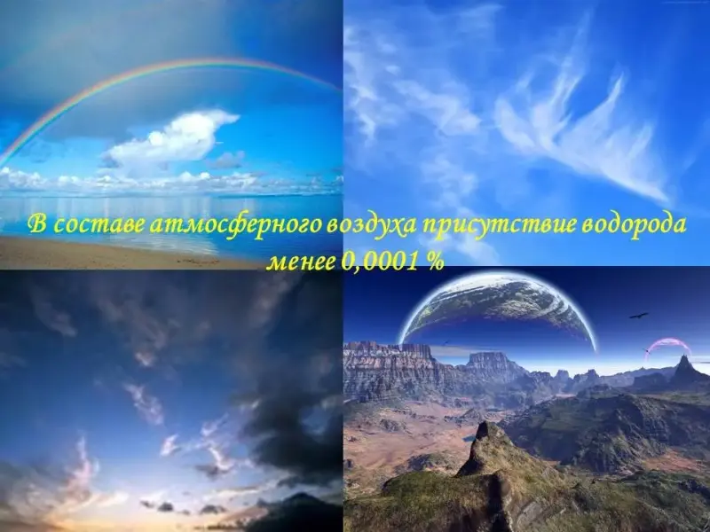 Н2О - вода (11% по массе), СН4 - газ метан (25% по массе), Органические вещества, в организмах животных и растений (в составе белков, нуклеиновых кислот, жиров, углеводов и др.), в теле человека - около 7 кг водорода. (Слайд 8) В земной коре - 1% В составе атмосферного воздуха присутствие водорода менее 0,0001 %. На долю водорода приходится 50 % массы Солнца и других звезд (Слайд 9, 10,11) |