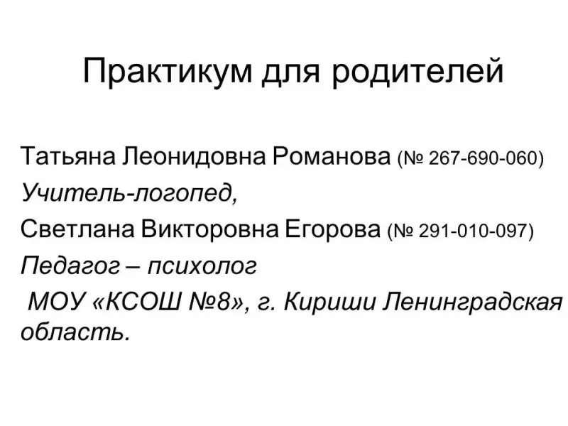 Практика показала, что с этих занятий родители всегда уходили с хорошим настроением: взрослые поиграли, сами ощутили свои возможности, убедились в том, что и у взрослых иногда возникают вопросы по словоизменениям, узнали новый, вполне доступный материал. Но главное, что после проведения занятий число детей поступающих в первый класс с теми или иными нарушениями устной речи резко снизилось. Поэтому мы решили предложить наш материал для печати в сборнике. Практикум может быть полезен для педагогов в дошкольном учреждении, для родителей, для проведения родительского собрания учителям начальных классов и нашим коллегам учителям-логопедам и педагогам-психологам. Желаем всем успехов.