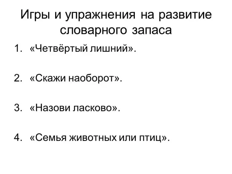 1) "Четвёртый лишний" (обобщает предметы по общему признаку, выделяет лишний предмет.) Следует обратить внимание на наиболее трудные на сегодняшний день разделы: времена года, их признаки, месяцы, дни недели, качества предметов, родственные связи. Ведущий называет четыре предмета, три из них имеют какое-нибудь сходство. Играющий должен назвать лишний предмет и объяснить, почему. Материал на карточке: ворона-ласточка-бабочка-воробей; трамвай-автобус-автомобиль-корабль; гитара-саксофон- флейта-труба; сосна-лиственница-ясень-пихта.