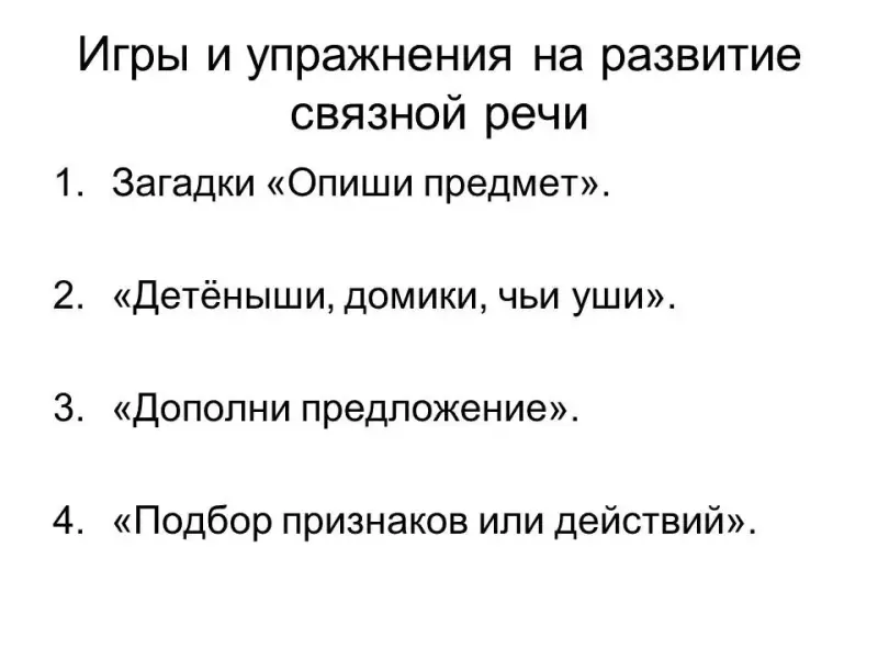 Будущий школьник должен уметь отвечать на вопросы, пересказывать, составлять рассказы по сюжетной картинке, серии картинок, может рассказать о себе; в состоянии описать игру, в которую играл; рассказать, как провёл день; объяснить, что ему хочется. Так же здесь нам поможет чтение книг и беседы о прочитанном. Можно использовать следующие игры (Слайд 17):