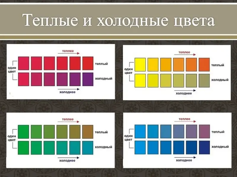 Абсолютным качеством теплоты/холода обладают только оранжево-красный полюс и сине-голубой. Все остальные цвета занимают промежуточное положение на шкале "теплый-холодный". Чем ближе цвет к холодному полюсу (сине-голубому), тем он холоднее. Чем ближе цвет к теплому полюсу (оранжево-красному), тем он теплее.