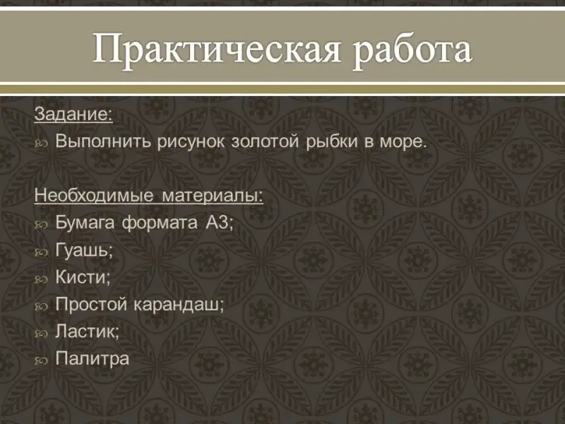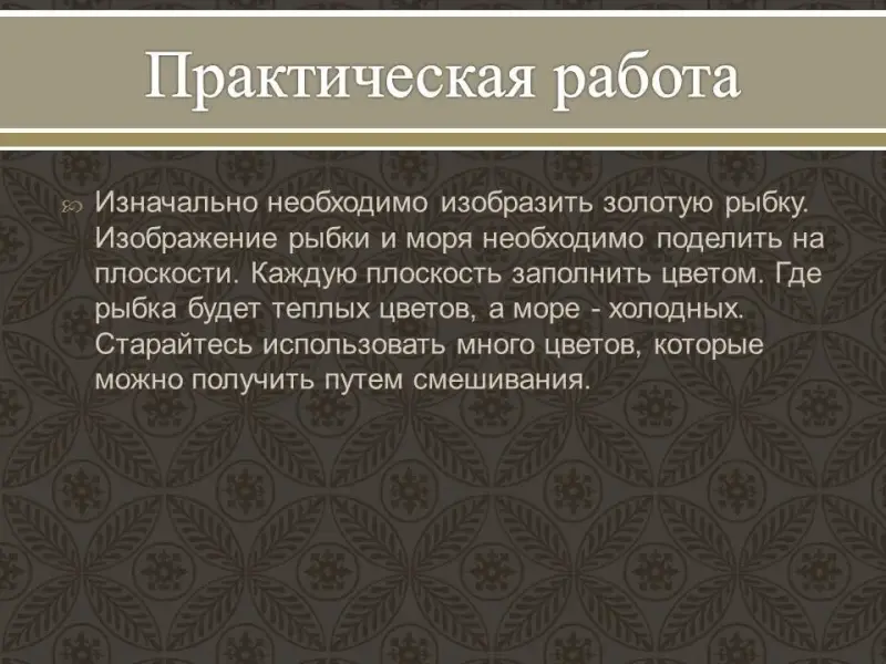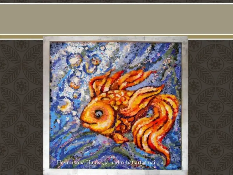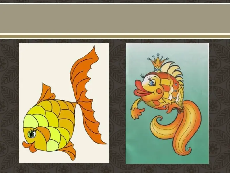 Изначально необходимо изобразить золотую рыбку. Изображение рыбки и моря необходимо поделить на плоскости. Где рыбка будет теплых цветов, а море - холодных. Старайтесь использовать много цветов, которые можно получить путем смешивания.