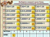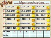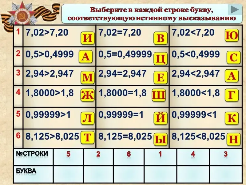 Слайд 14. Выберите в каждой строке букву, соответствующую истинному высказыванию (Катюша). Учащийся у доски составляет слово, передвигая маркером буквы в таблицу.