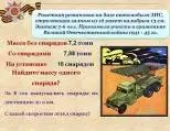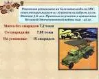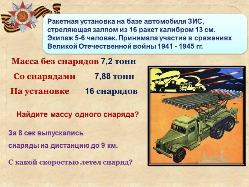 Катюша. Ракетная установка на базе автомобиля ЗИС, стреляющая залпом из 16 ракет калибром 13 см. Экипаж 5-6 чел. Принимала участие в сражениях Великой Отечественной войны 1941 - 1945 гг.