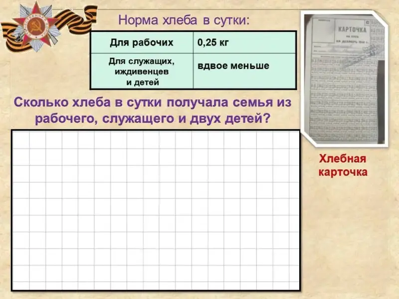 Сколько хлеба в сутки получала семья из рабочего, служащего и 2-х детей? Переведите в граммы.