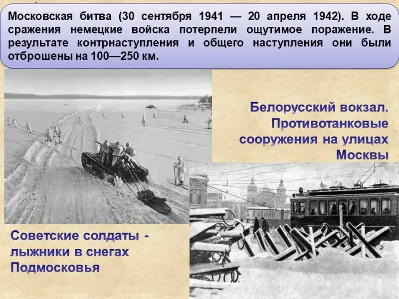 Московская битва (30 сентября 1941 - 20 апреля 1942). В ходе сражения немецкие войска потерпели ощутимое поражение. В результате контрнаступления и общего наступления они были отброшены на 100-250 км.