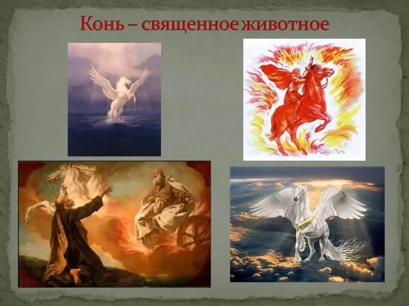 Это конь-огонь - солярная сила. Белая, золотая или огненная лошадь появляется вместе с богами солнца, впряженные в их колесницы. Лунная сила (элемент влаги, море и хаос) - это боевые кони океанических богов. Таким образом, лошадь символизирует как жизнь, так и смерть, а также быстрый бег времени. В виде чудесных коней представлялись все значительные явления природы - ветры, облака и грозовые тучи, быстрый проблеск молнии.