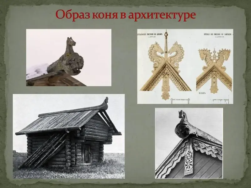 5 слайд - Русь с древнейших времен отождествляла себя с образом коня, что нашло воплощение в архитектуре Русского Севера. Верхний контур двускатного фронтона дома представлял небосвод, по которому двигалось солнце, а соединение колесовидного солнца с фигурой коня над кровлей подчеркивало динамизм строения. Изображения коньков охраняли жилища славян от вредных духов и враждебных навий.