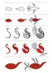 Важным элементом мезенского узора были птицы. Это были гуси, утки. Лебеди, также могли быть сказочные жар-птицы. Птицы всегда были символом стихии воздуха. Гуси, утки, лебеди так же несли в себе символ воды. Жар-птица - символ огня. Также в символику птиц вкладывался смысл оберега. Птицы тоже изображались двумя цветами - красным и черным. Последовательность изображения птиц представлена на схемах. (Слайд 6)