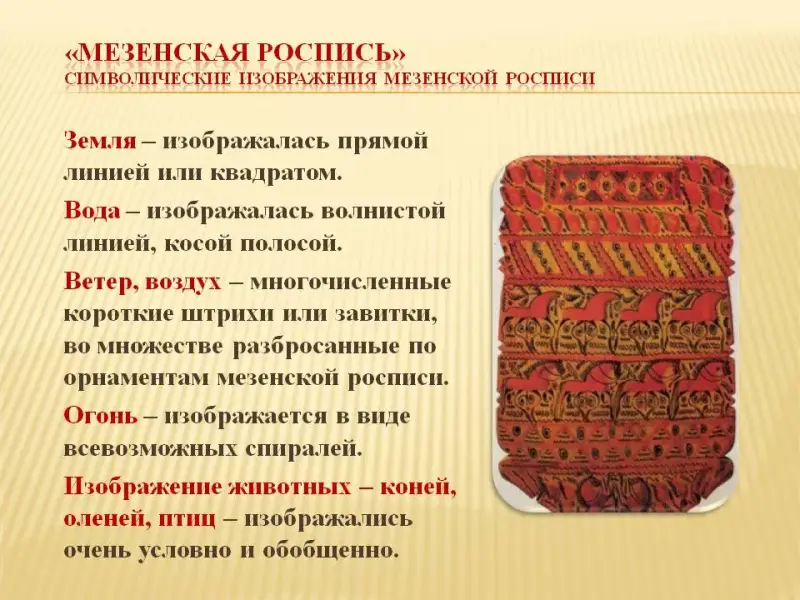 Узоры Мезенской росписи просты и лаконичны, каждый элемент имеет свой смысл. «Рисунками» Мезенской росписи можно написать целое сочинение, передать знаками какое-то послание. Зная их расшифровку,
