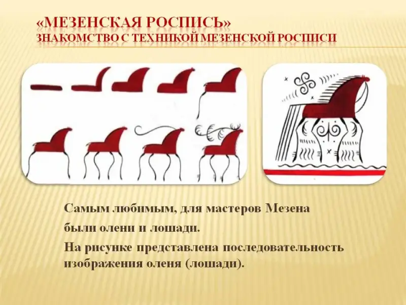 Теперь мы познакомимся с традиционным изображением животных мезенской росписи. Это изображение коней и оленей, изображение которых для мастеров Мезена всегда были самыми любимыми. Последовательность изображения коней и оленей (Слайд 7)