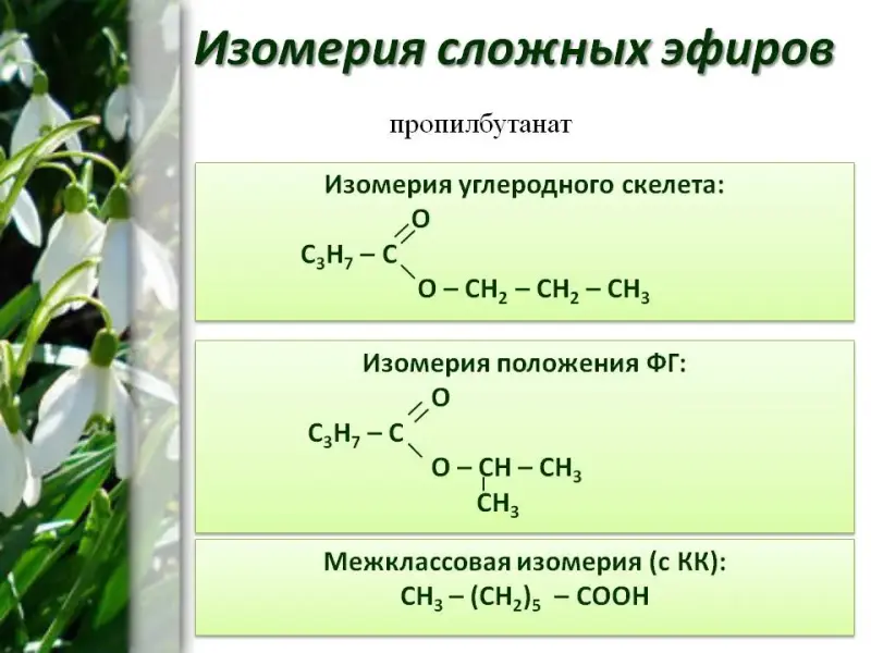 - Рассмотреть строение и виды изомерии сложных эфиров.