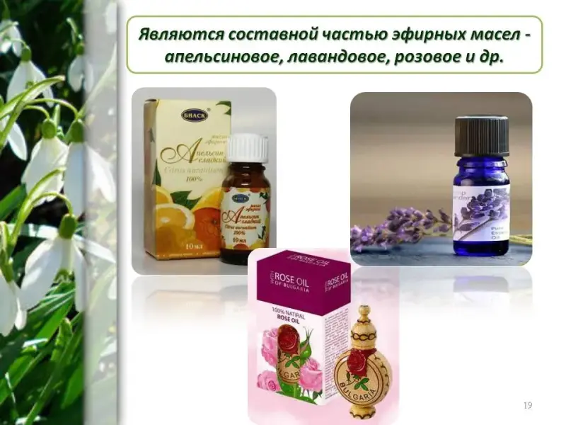 Являются составной частью эфирных масел (известно около 3000 эф.м. - апельсиновое, лавандовое, розовое и т. д.)