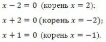 Произведение множителей равно нулю, если один из множителей равен нулю. Получаем три линейных уравнения:
