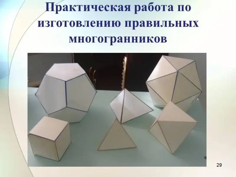 Учащимся предлагается изготовить развертки и модели правильных многогранников, выполнив необходимые измерения и расчеты. (Слайд 29).