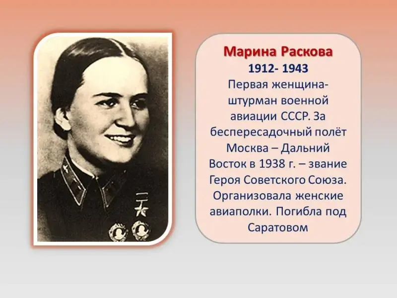5 слайд. Формирование трех женских авиаполков (полка пикирующих бомбардировщиков, истребительного полка и полка ночных бомбардировщиков) было возложено на легендарную Марину Раскову. Первая женщина-штурман военной авиации СССР. За беспересадочный полёт Москва - Дальний Восток в 1938 г. получила звание Героя Советского Союза.