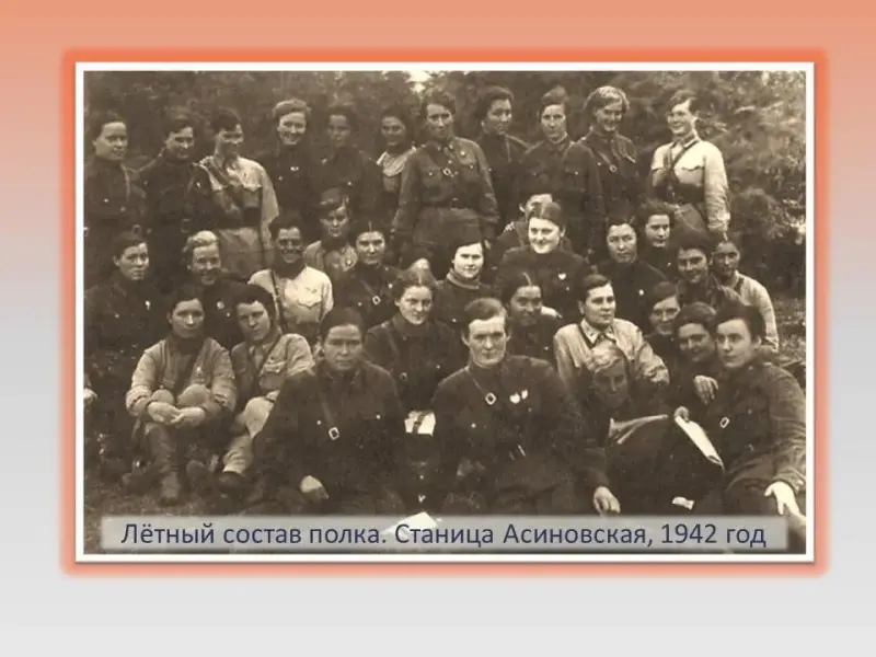 8 слайд. Фотография лётного состава сделана в станице Ассиновская. Это под Грозным. Здесь пробыли несколько месяцев. Под аэродром приспособили небольшую площадку перед колхозным садом. Летали много. За то, что не давали немцам ночью ни физического, ни морального отдыха, они прозвали экипажи советских лётчиц "ночными ведьмами". А "ведьмы" были молодыми красивыми девушками в возрасте 17-22 лет.