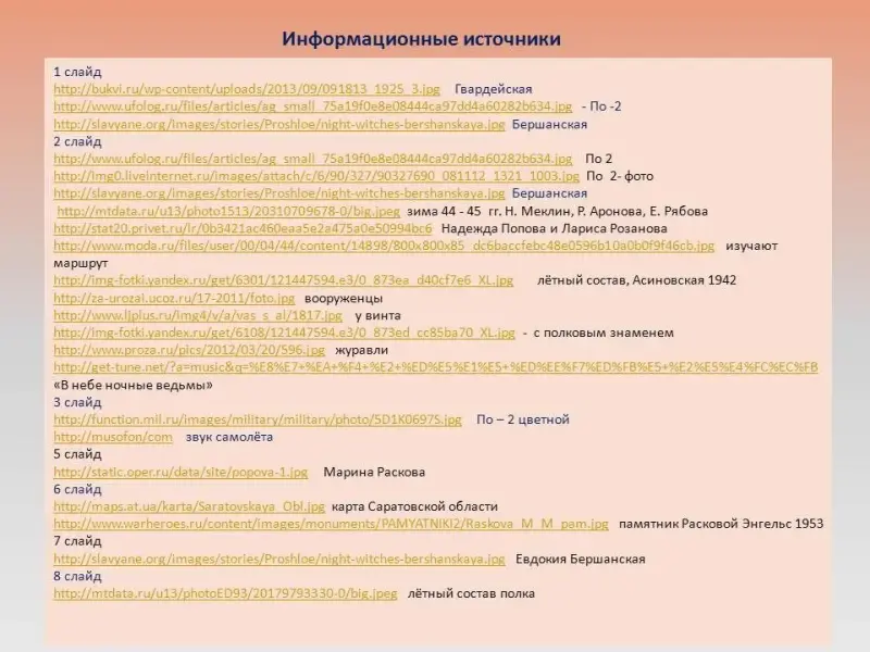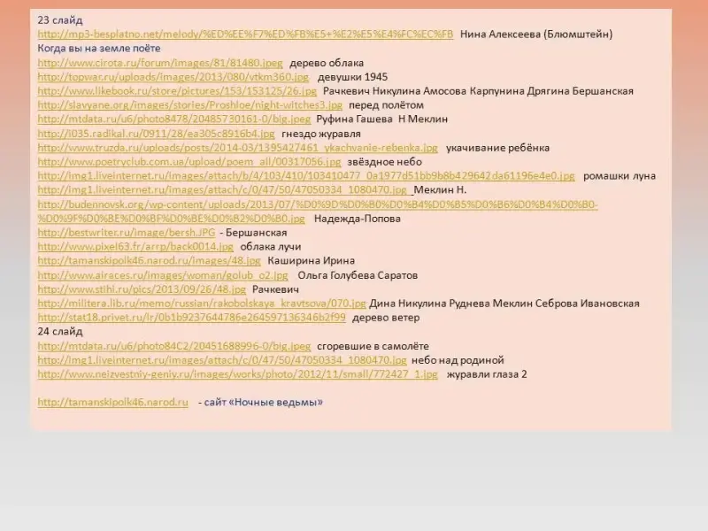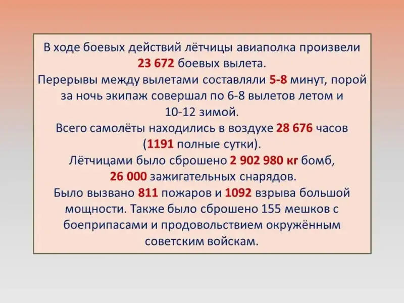 9 слайд. Зачитывается текст. После этого задайте вопрос: Что стоит за этими цифрами? Включите воображение. Поставьте себя на место наших лётчиц. Если ловят в перекрестье несколько прожекторов, а потом начинают бить зенитки.