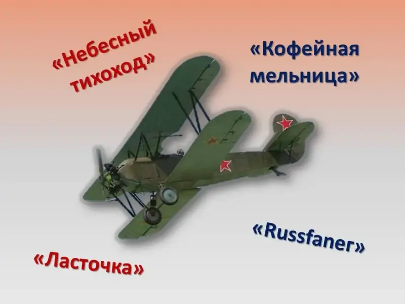Девушки нежно назвали свои машины "ласточками", но широко известное их название - "Небесный тихоход". Фанерный самолетик с маленькой скоростью. Немцы презрительно называли "Рус фанер" или "Кофейной мельницей". Но По-2 не давали покоя немцам. В любую погоду они появлялись над передовой и на малых высотах бомбили их. Урон от ночных полётов был настолько велик, что немцы наших девушек ненавидели. Прорываясь на низкой высоте к железнодорожным узлам, штабам и переправам, они вдребезги разносили стратегические объекты. А через час нахально возвращались - на добивание. Презрительное "Рус фанер" быстро изменилось на известное всем "ночные ведьмы" - и закрепилось намертво. Наши легкие ночные бомбардировщики настолько сильно досадили врагу, что он решил бросить против "По-2" ночных истребителей.