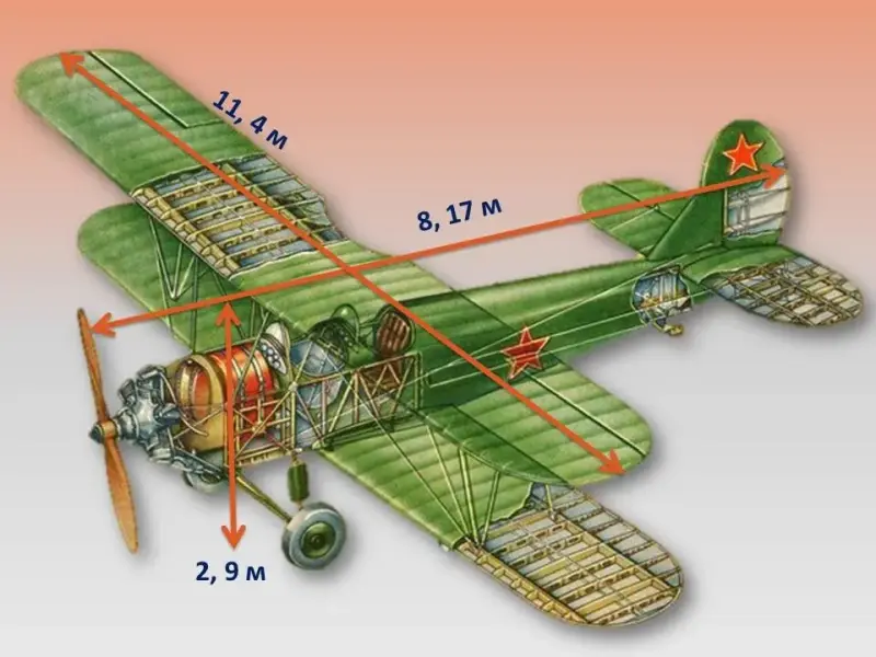 Размеры небольшогоУ-2 (длина - 8, 17 м, высота - 2,9 м, размах крыльев - 11,4 м) Он мог совершать взлет и посадку на самых малых аэродромах и даже на неподготовленных площадках. Вес пустого самолета в учебном варианте - 635-656 кг, с бомбами - до 1400 кг. Дальность полёта до 800 км. Средняя высота полёта около 500м, а потолок - 3800 м, разбег и пробег - 100-150 м.