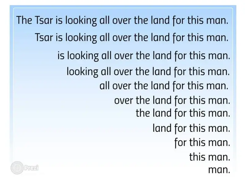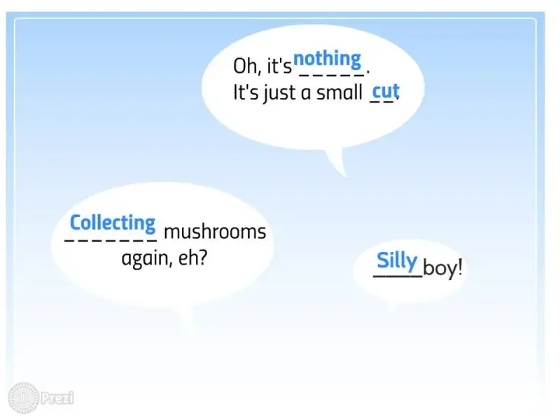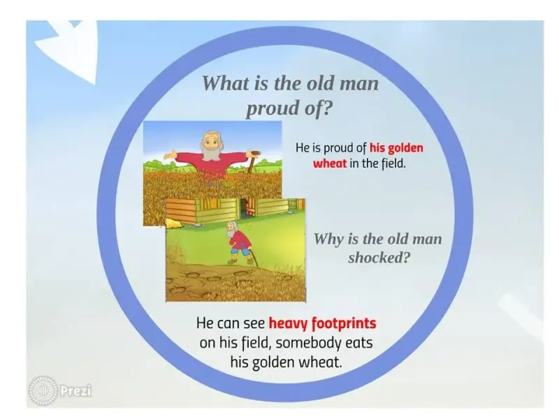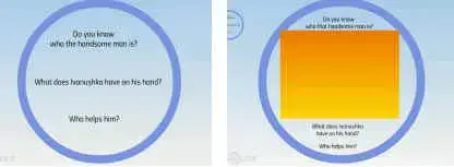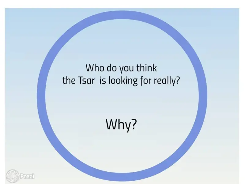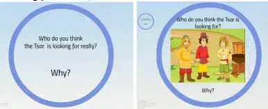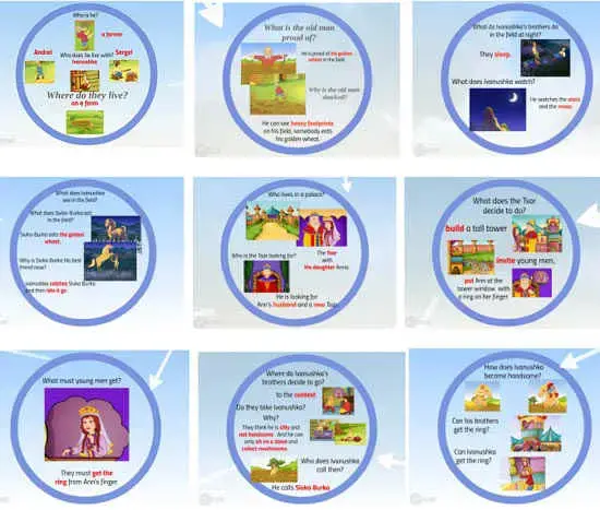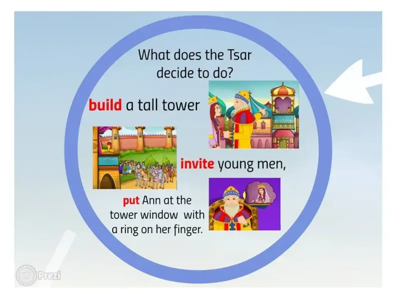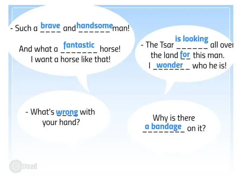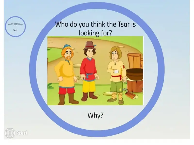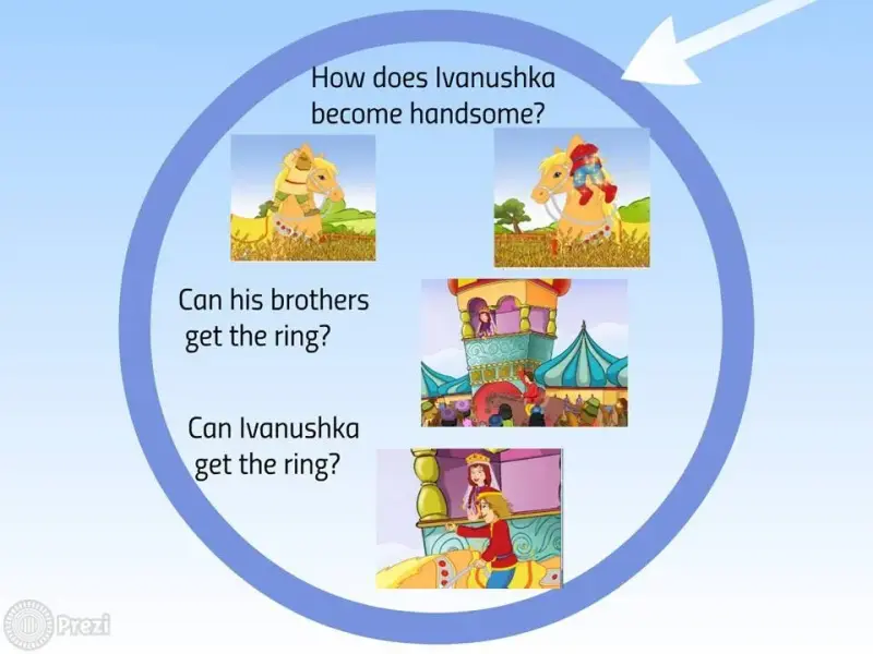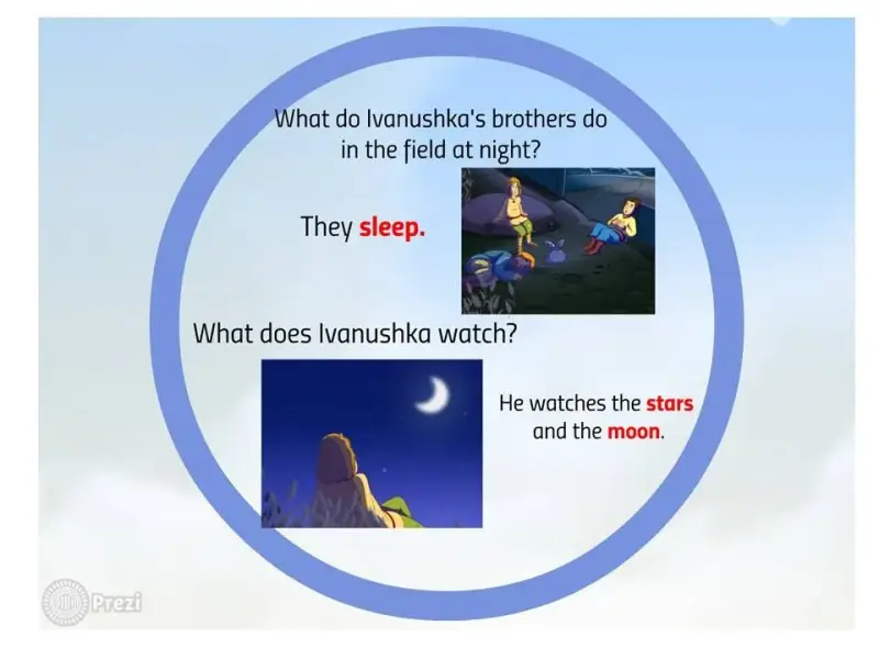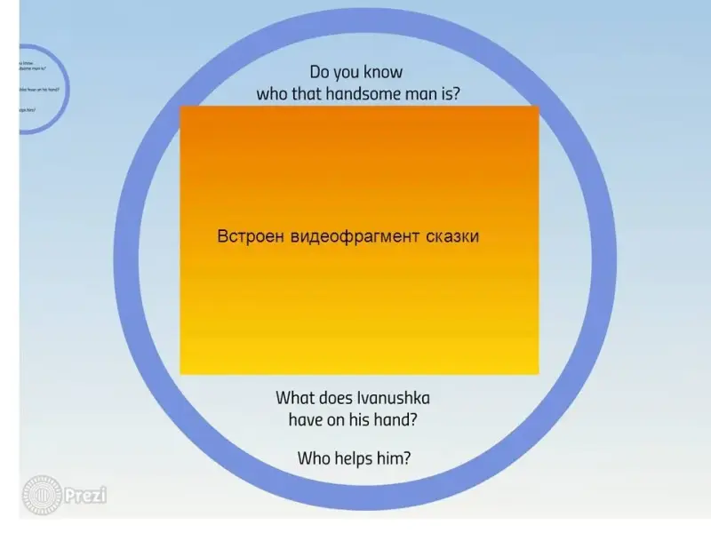Не смотря на большой объем информации, программа Prezi позволяет быстро провести опрос и, в случае, если ученики не помнят ответ или не могут его сформулировать, вы сразу же сможете показать им правильный ответ, и они быстро восстанавливают события сказки и вспоминают трудно запоминающиеся слова. Для этого при формировании вопросов необходимо старательно использовать эти слова в самом вопросе или в предполагаемых ответах. Это помогает быстро актуализировать знания. Рекомендуемые вопросы и ответы: